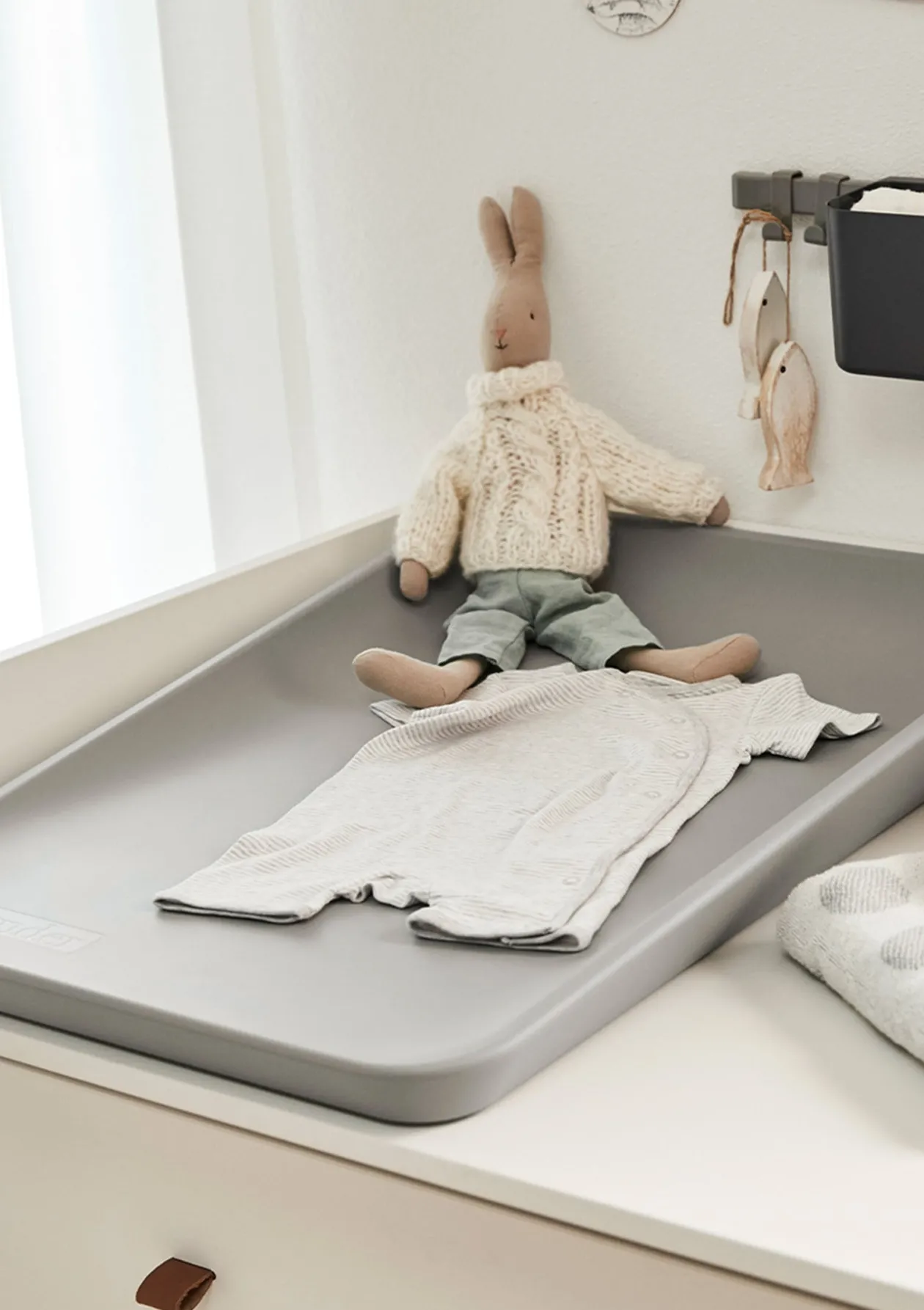 - feste Unterlage aus Holz und kleine Gummifüße für Stabilität und sicheren Sitz auf Wickeltisch oder anderen glatten Flächen