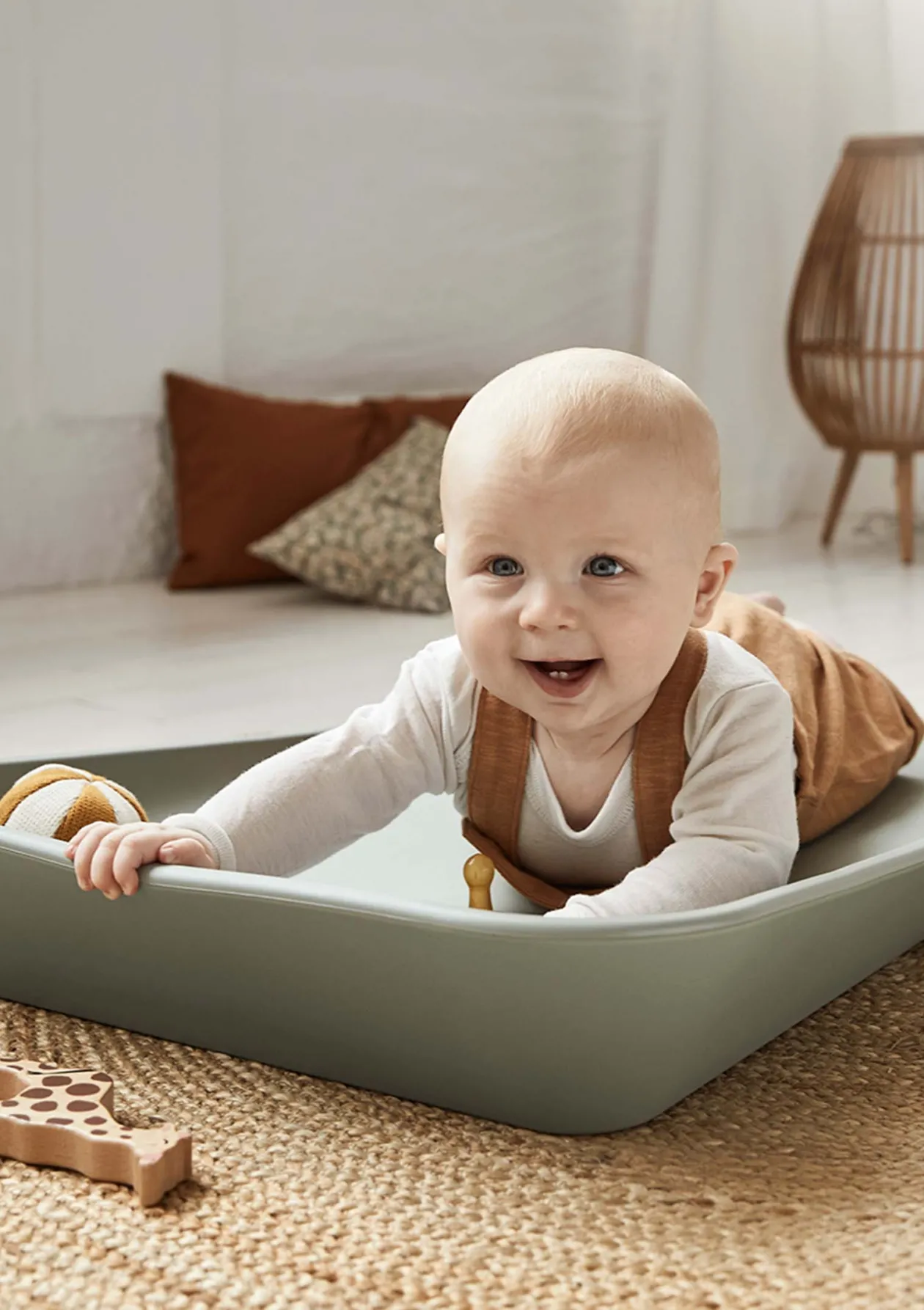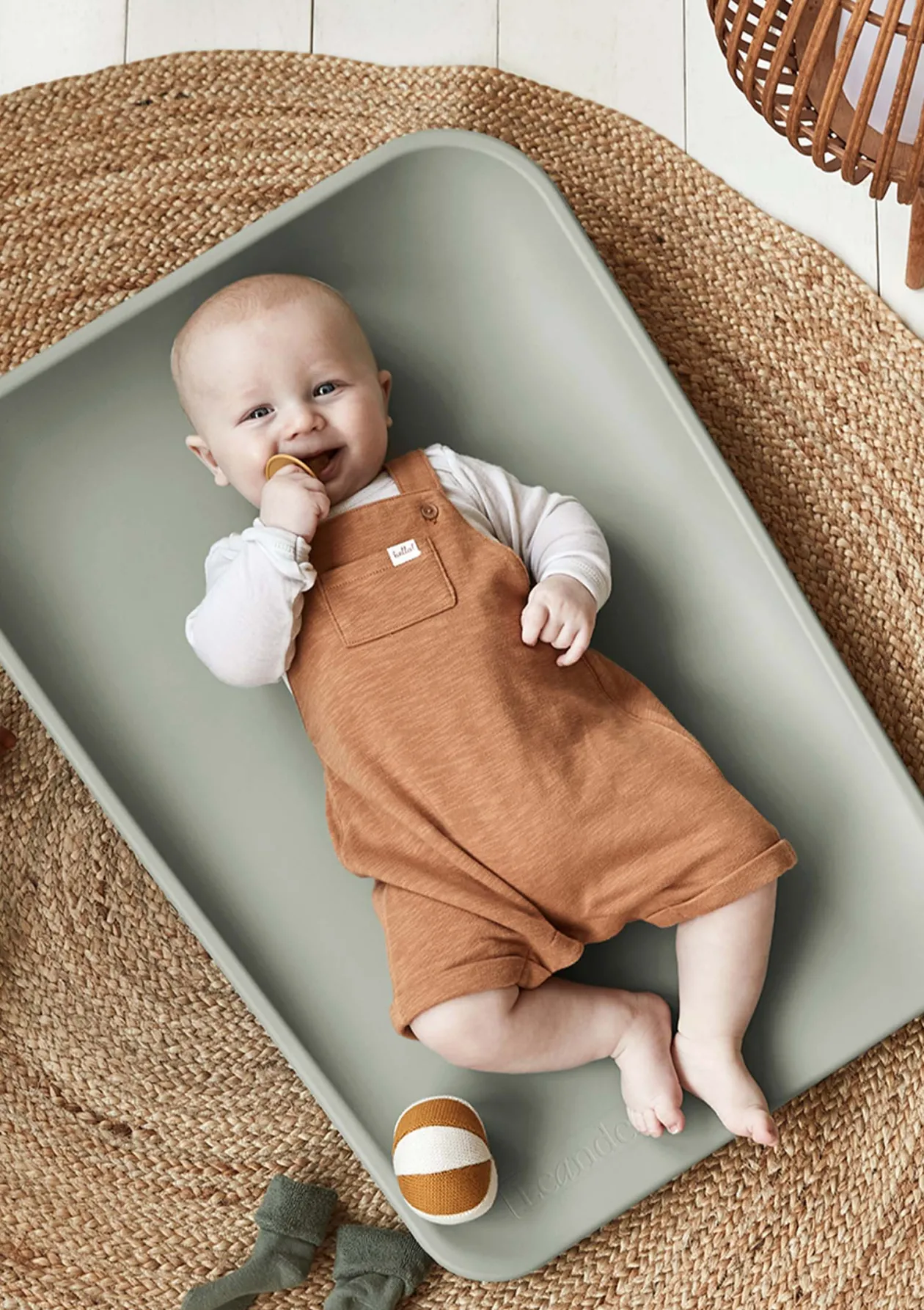 - feste Unterlage aus Holz und kleine Gummifüße für Stabilität und sicheren Sitz auf Wickeltisch oder anderen glatten Flächen